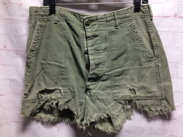 Military fatigue shorts, cut-off, cotton, button-up, front & back pockets, frayed/ripped/jagged cut, distressed, olive-green