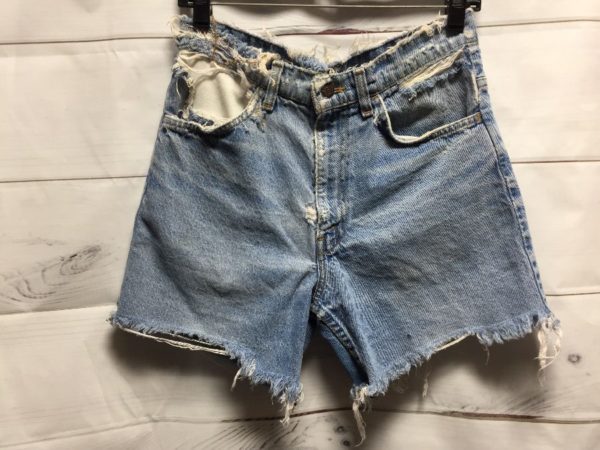 Levis denim shorts, cut-off, longer length, frayed hems, orange tab, perfect, super distressed, medium blue, size 28W