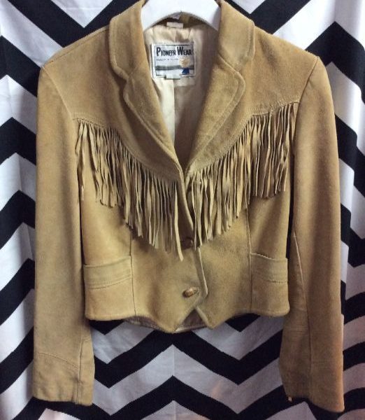 Jacket, suede leather, button-up, fitted, fringe trim, tan, size S
