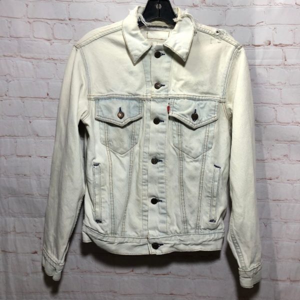Levis denim jacket, button-up, red tab, bleached, perfectly distressed, frayed collar, bluish tint, off white, size small fit As is
