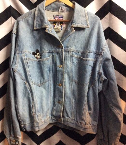Disney denim jacket, button-up, screen printed Mickey Mouse full back graphic, light wash, blue/multi, size M oversized