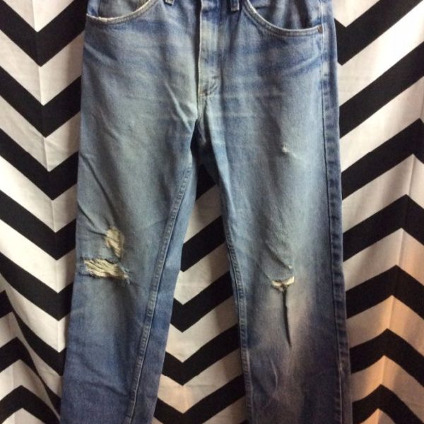 RETRO LEE DENIM JEANS, ACID WASHED, WORN/BROKEN IN, SHREDDED HOLES IN KNEES, MEDIUM-BLUE, SIZE 28W