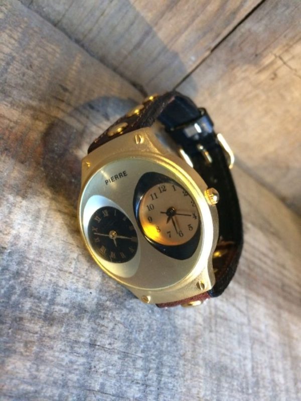 1980’S PIERRE WRISTWATCH, DOUBLE CLOCK FACES IN SINGLE BEZEL ONE WITH ROMAN NUMERALS ONE WITH STANDARD NUMBERS, LEATHER STRAP, METAL RIVET EMBELLISHMENT, BLACK/BROWN/GOLD