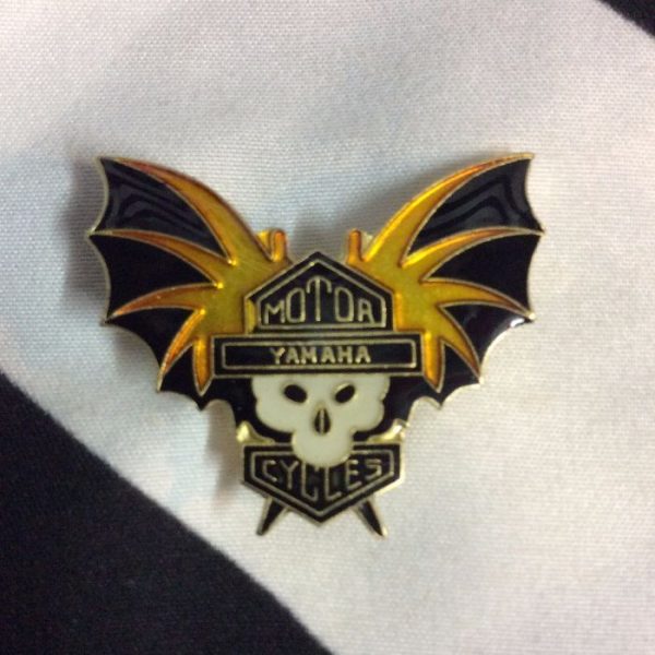 PIN, YAMAHA MOTORCYCLES, SKULL WITH BAT WINGS DESIGN, BLACK/WHITE/GOLD