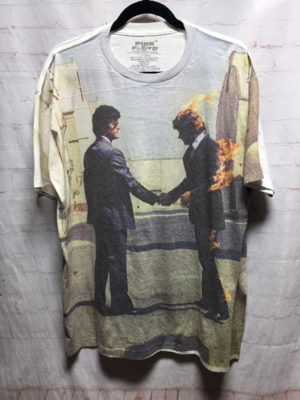 Pink Floyd T-shirt, man on fire handshake, Wish You Were Here, screen printed front graphic, white/navy blue/orange/black, size XL As is