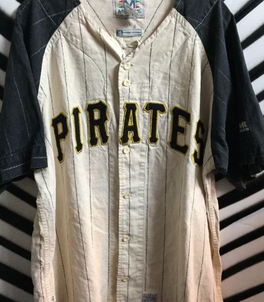 Pittsburgh Pirates baseball jersey, short sleeve button-up, two-toned, pinstriped design, applique lettering, tan/black, size XL