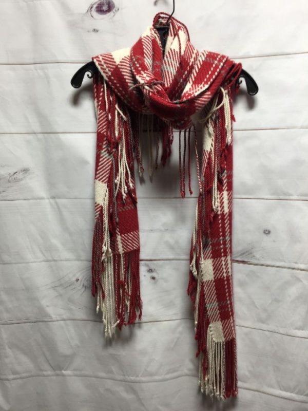 Gap scarf, wool blend, soft flannel feel, woven fabric construction, plaid design with fringe, red/white/gray, size one size