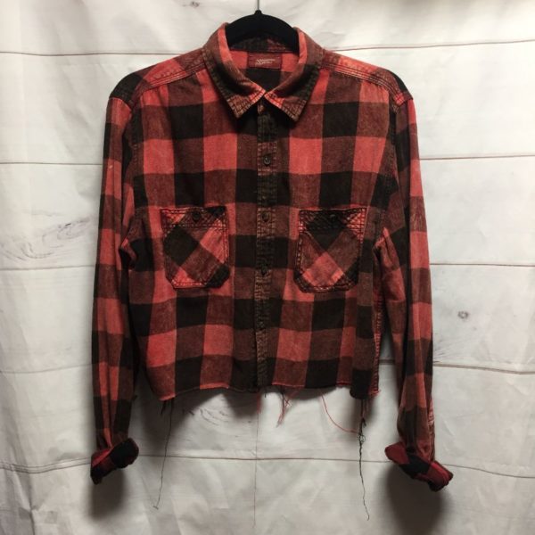 DISTRESSED CUSTOM DYED & CROPPED PLAID LONG SLEEVE CROPPED BUTTON UP FLANNEL SHIRT