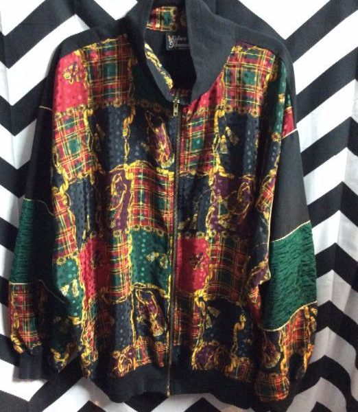 Silky bomber jacket, zip-up, plaid print Baroque design, red/green/black, size XL