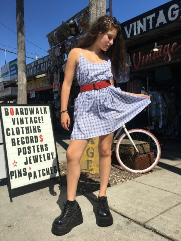 Victoria Secret dress, polyester, baby doll style, spaghetti straps, short length, plaid print, front pockets, blue/white, size M