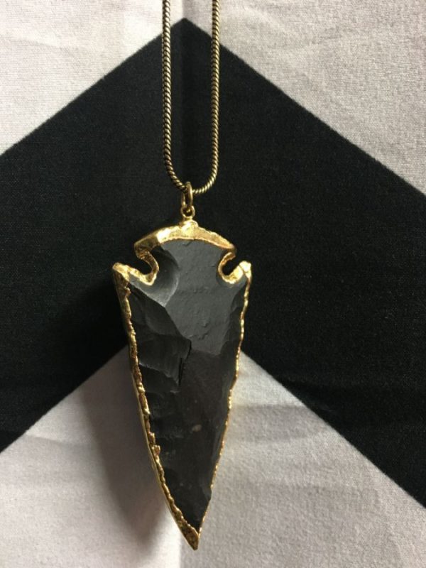 Necklace, flint knapped arrow pendant, plated metal outer edge, brass snake chain, brass/black/gold