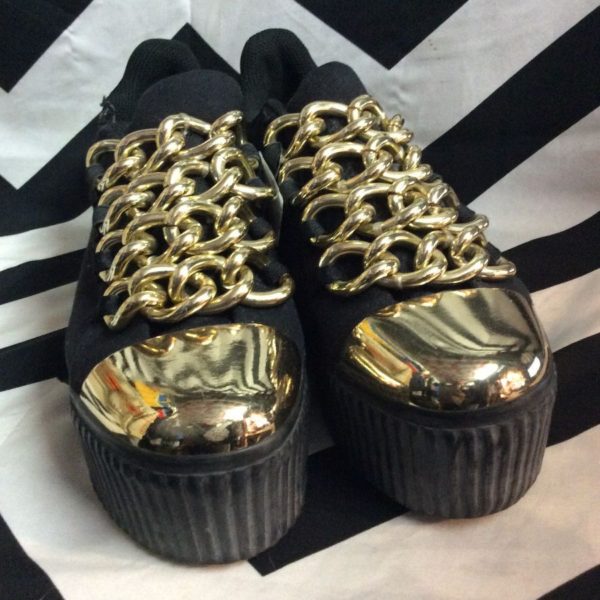 Shoes, platform creepers, metal toes & chains, black/gold, size 9