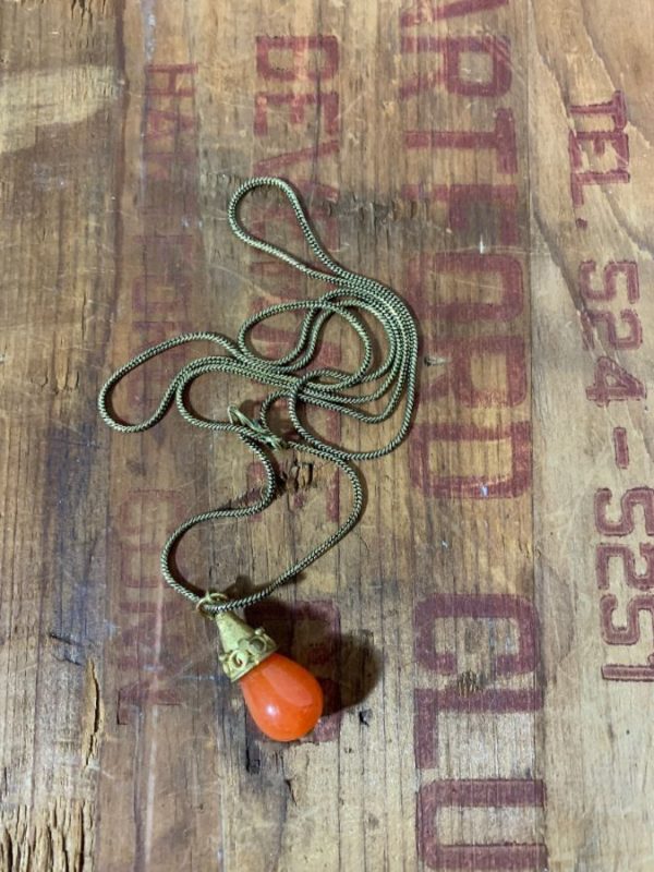 Necklace, pendant, polished tear drop shaped stone, brass metal snake chain, gold/orange