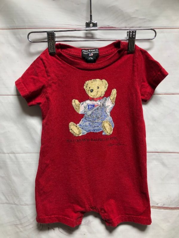 Polo Jeans Co. baby onesie, snap-up crotch, classic Polo bear design, screen printed front graphic, red, size 12-18M