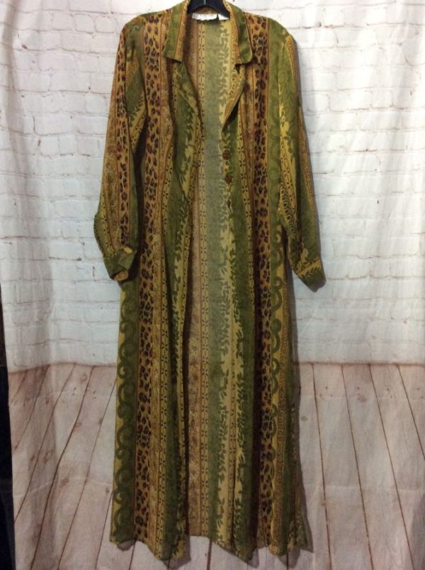 Kloz Line Kimono cardigan Jacket, polyester, long sleeves, open front, long length, animal & floral print in a vertical stripe pattern, olive green/brown, size S