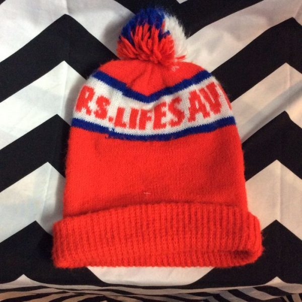 Beanie, pom poms, Lifesaver lettering, red/white/blue