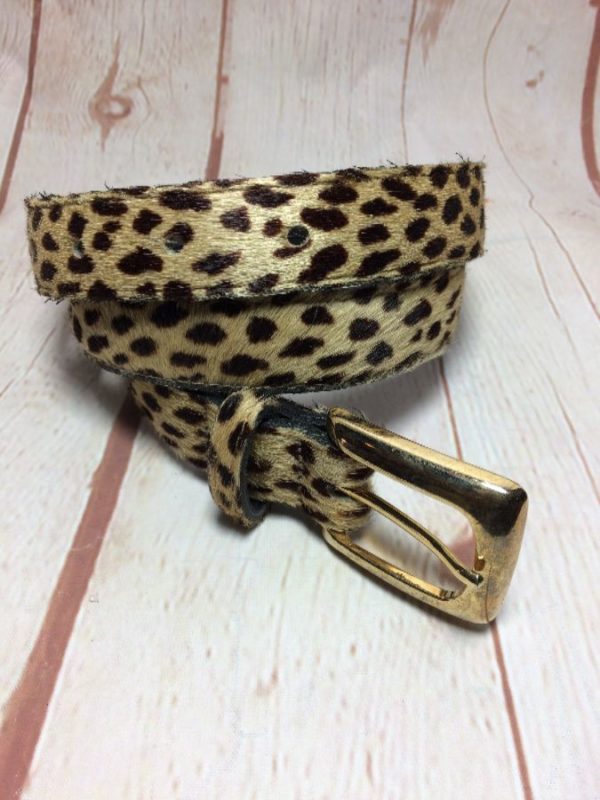 Belt, leather, pony hair, narrow width, Leopard print design, rectangular buckle, tan/brown/gold, size M