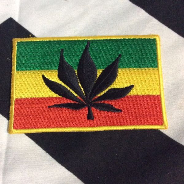 Embroidered patch, marijuana leaf, Rasta flag, yellow/green/orange/black, size 2″ x 3.5″