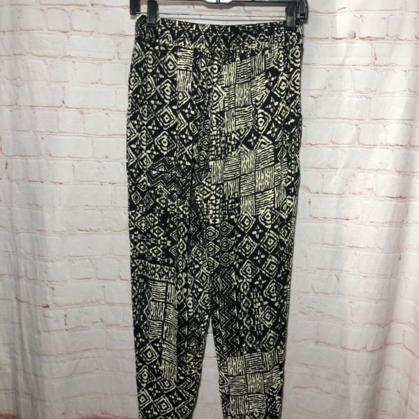 Jogger pants, elastic waist, tapered legs, abstract graphic print design, black/white