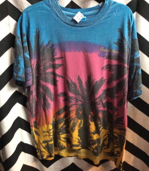 T-shirt, Puerto Rico, sunset & palm tree design, pink/blue/orange