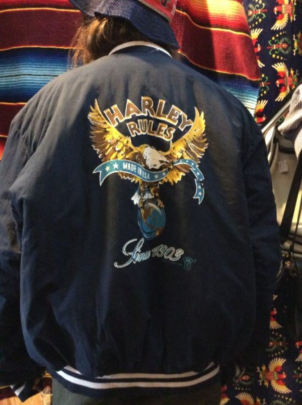 1987 HARLEY DAVIDSON BASEBALL STYLE JACKET, PUFFY, BUTTON-UP, \HARLEY RULES\ SINCE 1903 MADE IN AMERICA, SCREEN PRINTED BACK GRAPHIC