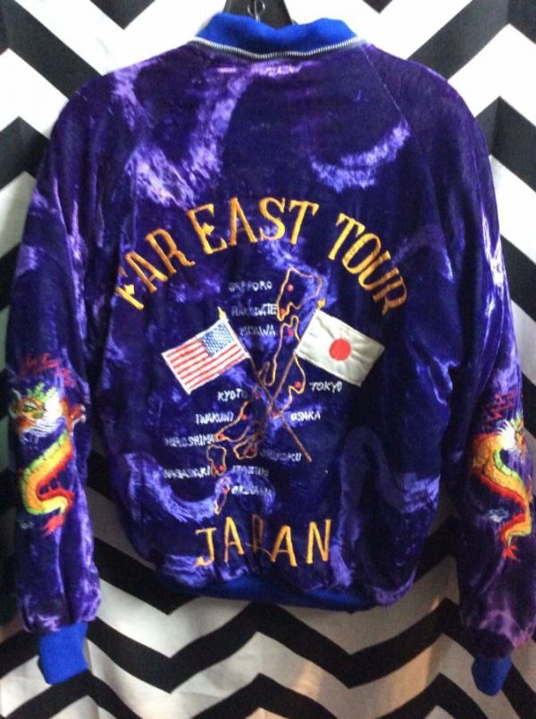 Souvenir bomber jacket, velvet, zip-up, Japan Far East Tour, embroidered back flag design & dragons on sleeves, purple/gold/multi, size M