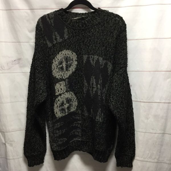 UMBERTO GINOCCHIETTI SWEATER, PULLOVER, CHUNKY KNIT, MADE IN ITALY, CIRCLES WITH CROSS-HAIRS & DIAMONDS DESIGNS, BLACK/GRAY