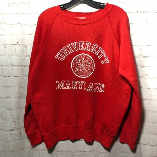 Bassett Walker sweatshirt, pullover, crew-neck, University of Maryland, screen printed shield & lettering in full front design, red/white, size M 38/40