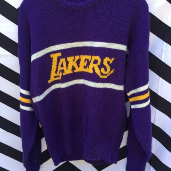 CLIFF ENGLE PULLOVER SWEATER, KNIT, LOS ANGELES LAKERS, STRIPED SLEEVES & HORIZONTAL STRIPE W/LAKERS LETTERING