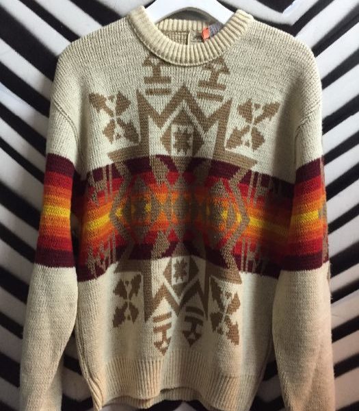 Vintage 1970’s Pendleton pullover sweater, Native American design, cream/multi-color stripe, size L