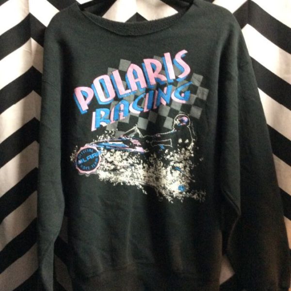 Pullover sweatshirt, cut neck, Polaris Racing, screen printed snowmobile graphic, black/blue/multi, size XL