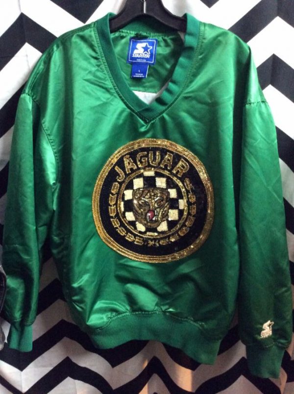 Starter jacket, pullover, satin, v-neck, green, size L with sequin Jaguar patch