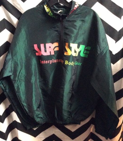 Surf Style pullover windbreaker, iridescent fabric, neon color lettering, green jacket/neon multi lettering, size XL one size fits all