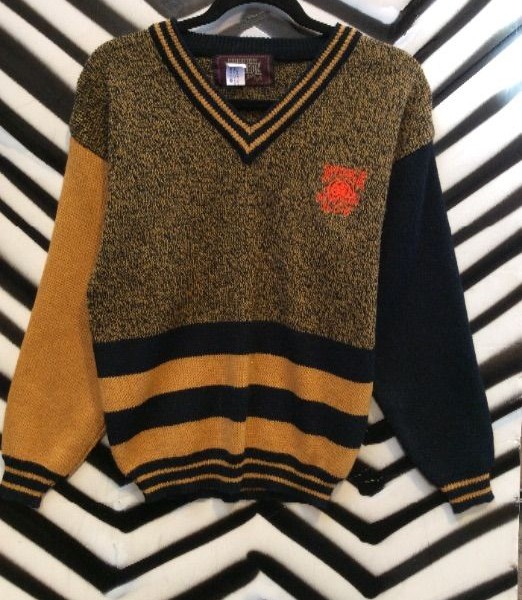 Bugle Boy varsity style pullover sweater, orange embroidered logo, black/mustard