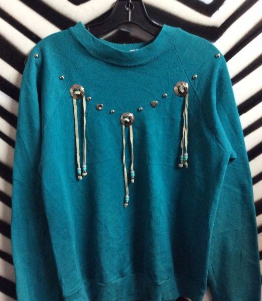 Pullover sweatshirt, with silver conchos, beads and leather tassels, teal, size L
