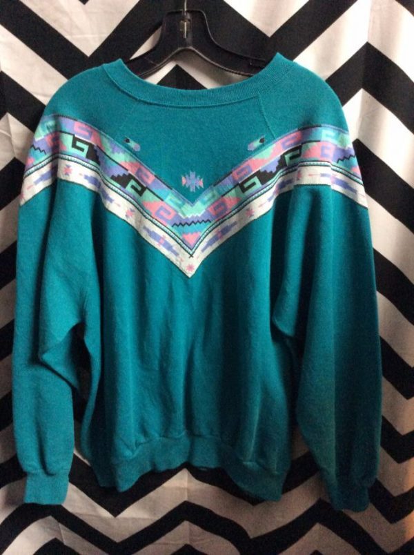 Tultex pullover sweatshirt, Native American accent design, striped trim, turq/white/pink/black, size XL