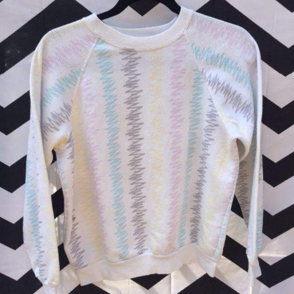 Pullover sweatshirt, scribbled vertical lines design, white/multi-color pastel, size L small fit