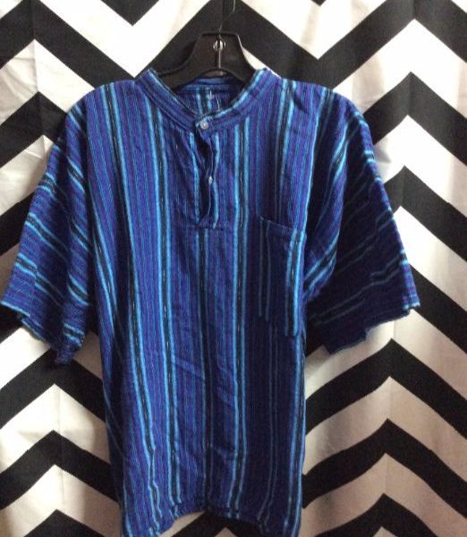 1990’s shirt, pullover, short sleeves, button-up neck, front pocket, textile with vertical stripe pattern, purple/blue, size M