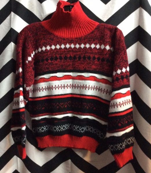PULLOVER SWEATER, CROPPED, TURTLE NECK, KNIT, RED/WHITE/BURGUNDY/BLACK