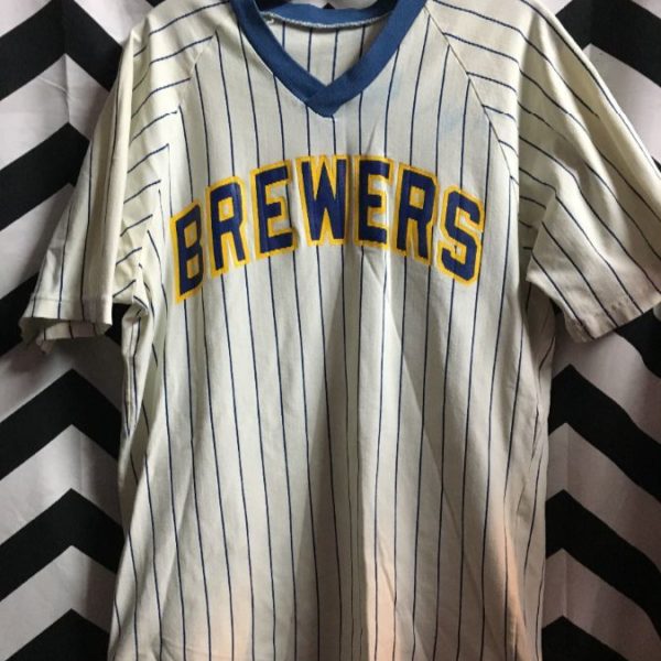 Pullover baseball jersey, short sleeve, v-neck, Brewers, pinstriped fabric, contrasting neck trim, white/blue/yellow as is