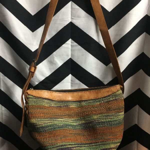 WOVEN TEXTILE PURSE W/ LEATHER STRAP & 1 ZIPPED OPENING