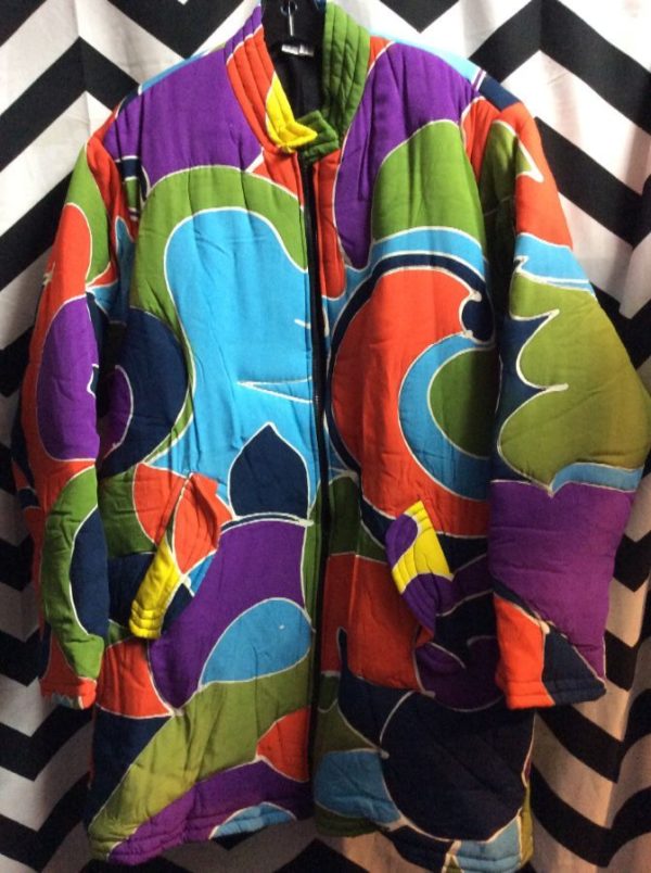 Trench coat jacket, zip-up, quilted, puffy, color-block design, dead-stock, purple/green/black/orange/yellow/blue, one size fits all