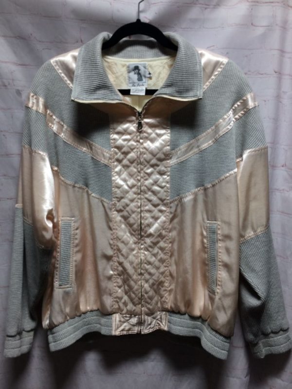 La Perle satin jacket, polyester, zip-up, quilted & thermal panels color-block design , pale pink/light gray, size XL