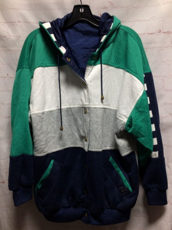 1980’s Current Seen windbreaker jacket, hooded with drawstring, reversible with satin finish one side & sweatshirt on the other, snap-up, horizontal stripes in color-block design on sweatshirt side & solid on the other, rad, navy blue/green/white/gray, size M