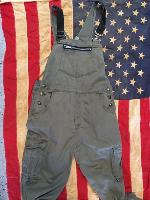 1990’s Forenza overalls, twill, button-up sides, adjustable straps, zippered pouch pocket, cargo pockets, rad, military green, size M