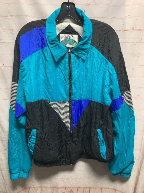 Eagles Ridge windbreaker jacket, zip-up, rad triangle striped patchwork in color-block design, front pockets, black/blue/white/teal, size L