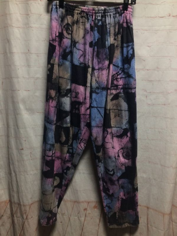 Just For Fun pants, cotton, harem style, soft, funky abstract print, pastel colors, rad, purple/blue/black/tan, size one size
