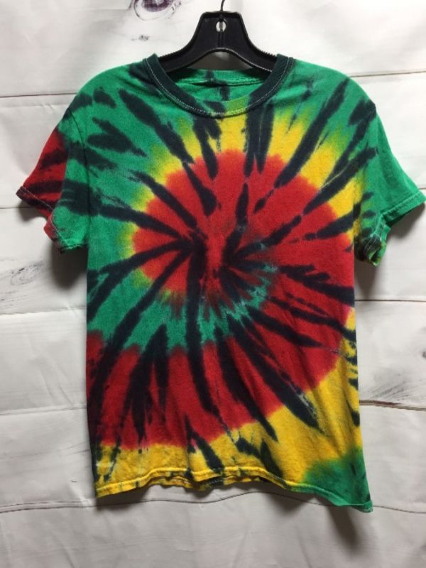 T-shirt, tie-dyed, rasta colors, spiral patterned design, rad, black/yellow/red/green/blue, size S