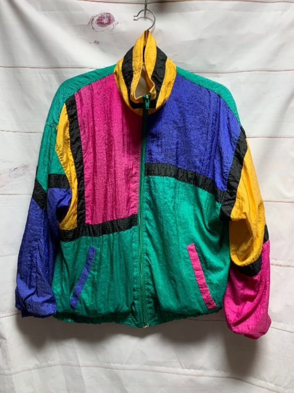 Blair Boutique windbreaker jacket, zip-up, patchwork stain-glass look color block design, radical, amazeballz, teal/pink/blue/yellow/black, size M As is