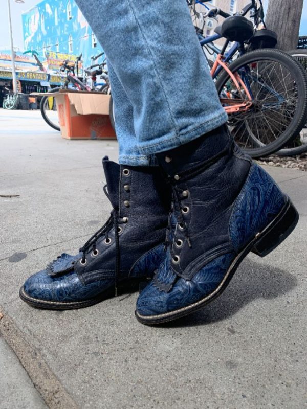 Laredo cowboy boots, Roper style, lace-up, ankle high, leather, fringe kiltie, embossed & tooled floral design on kiltie/vamp/heel, radical, black/blue, size 6 1/2
